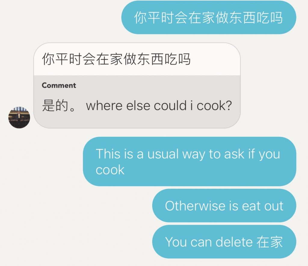 Then I realized the phrase “At home” misled him. “At home” can be deleted in this sentence but it’s a common way to say that in Chinese (I double-checked with my friends). I should not assume he will understand before I asked this question in my usual way.