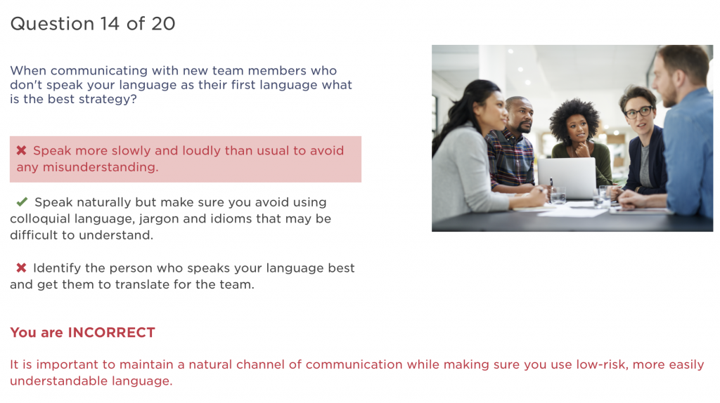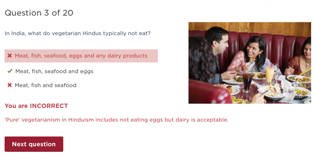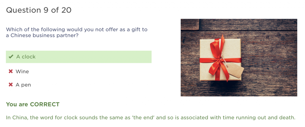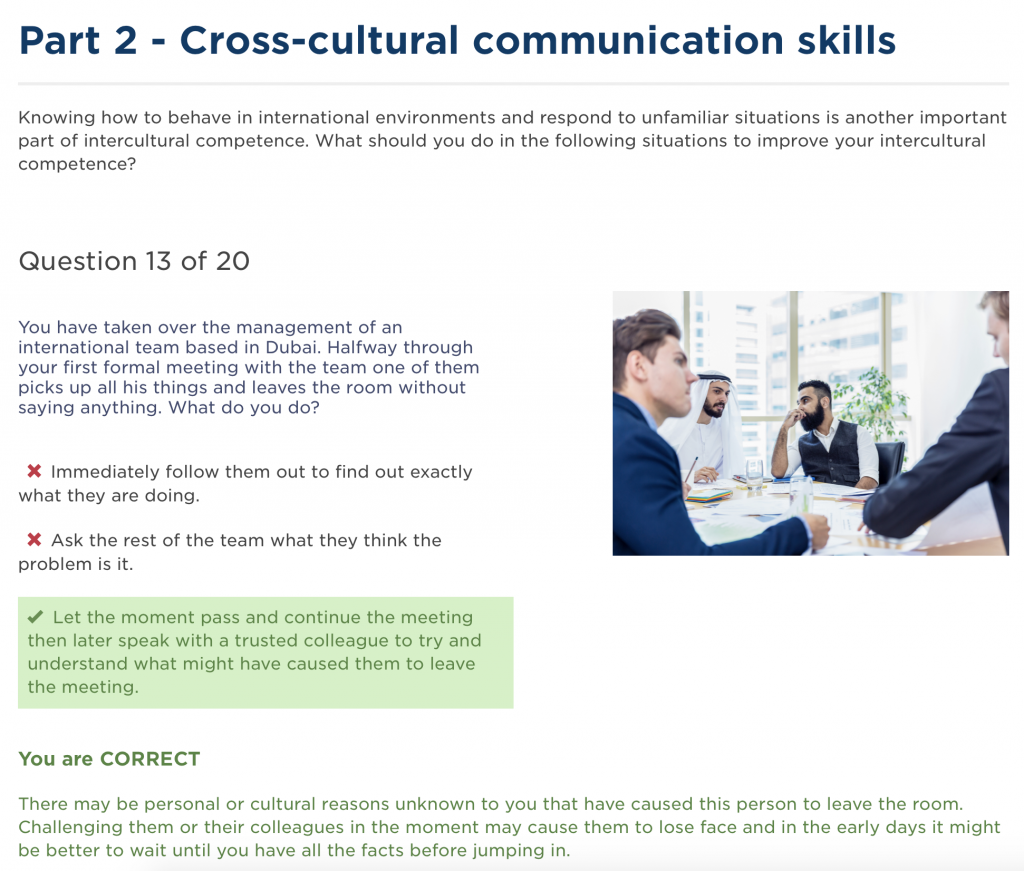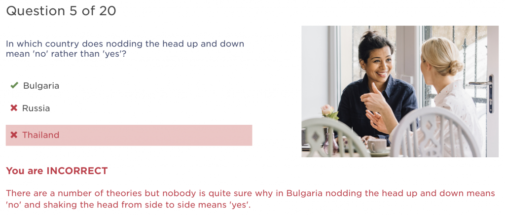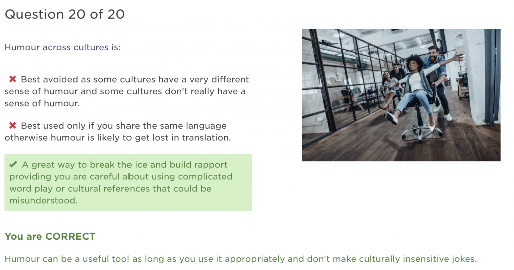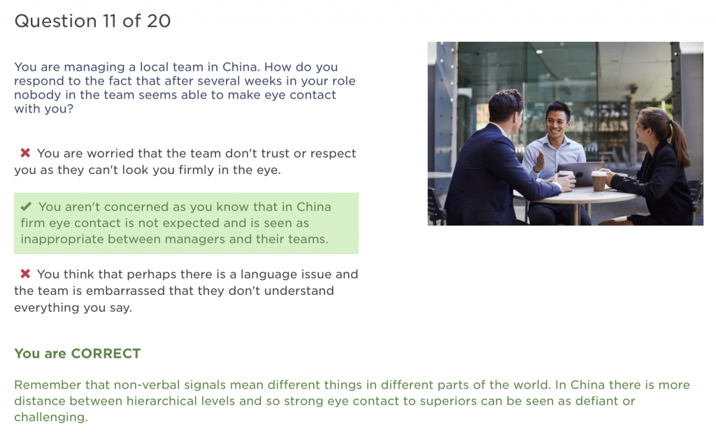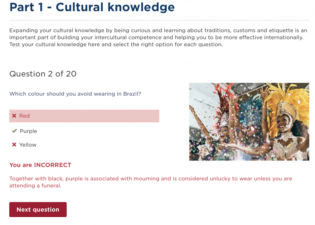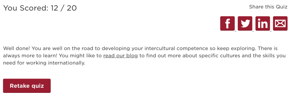 The London School of International Communication also provides an online quiz to test intercultural competence. It includes two parts which are cultural knowledge and cross-cultural communication skills. By doing this quiz, I found I lack cultural knowledge of many countries such as Brazil, India and so on.